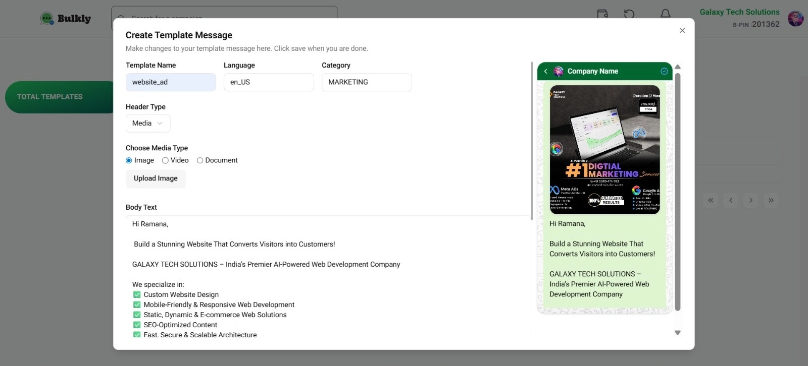 Craft beautiful WhatsApp messages with ease. Bulkly’s template